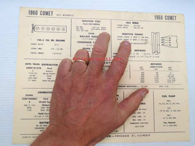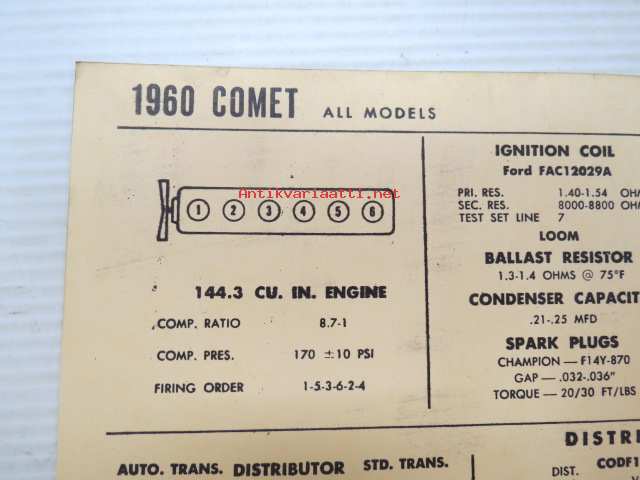 Comet All Models 1960 Data sheet / Sun Electric Corporation -säätöarvot taulukko