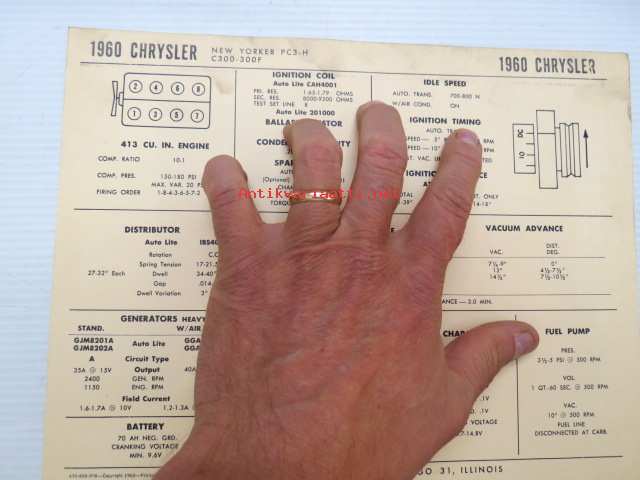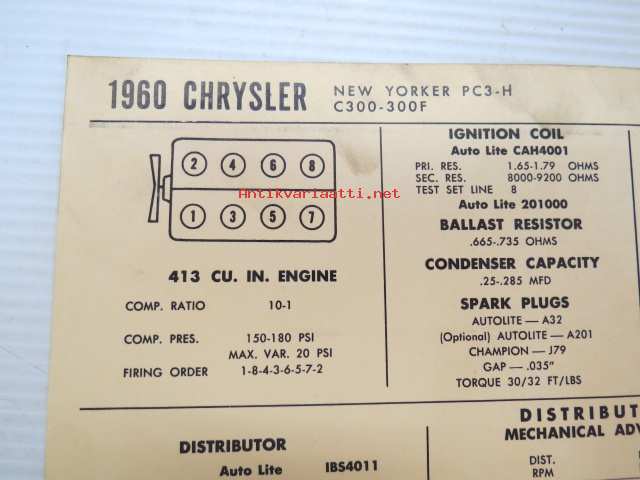 Chrysler New Yorker PC3-H C-300-300F 1960 Data sheet / Sun Electric Corporation -säätöarvot taulukko