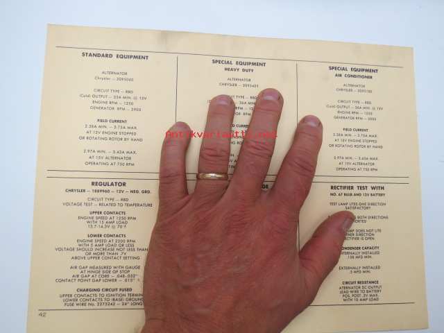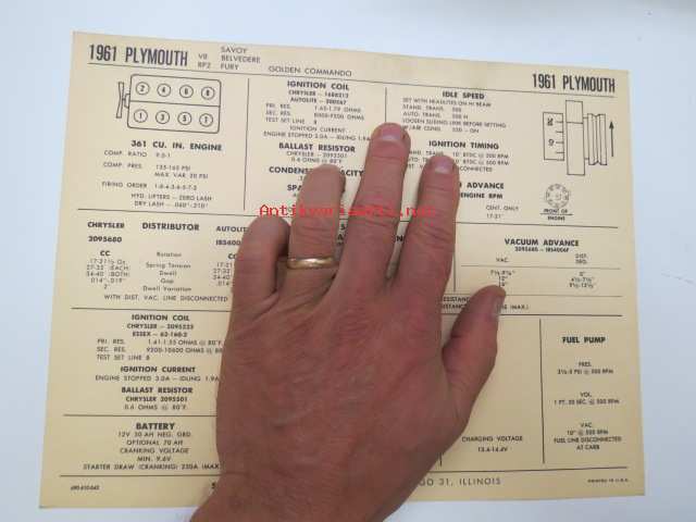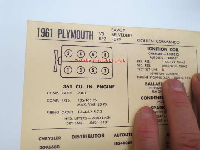 Plymouth V8 - RP2, Savoy, Belvedere, Fury, Golden Commando 1961 Data sheet / Sun Electric Corporation -säätöarvot taulukko