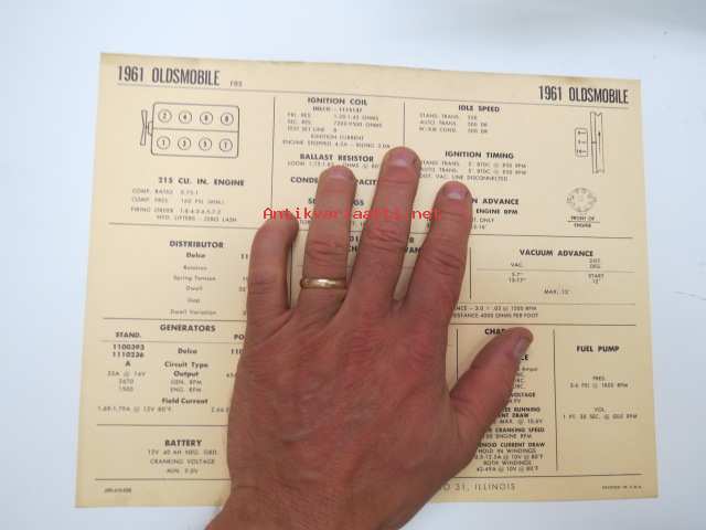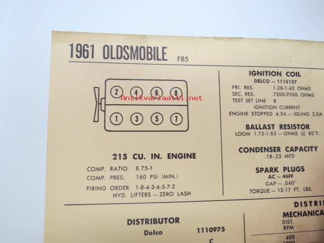 Oldsmobile F85 1961 Data sheet / Sun Electric Corporation -säätöarvot taulukko