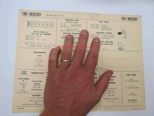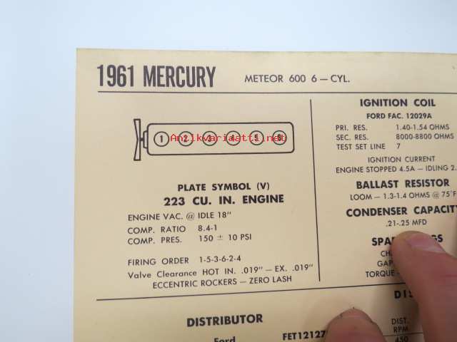 Mercury Meteor 600 6-cyl. 1961 Data sheet / Sun Electric Corporation -säätöarvot taulukko