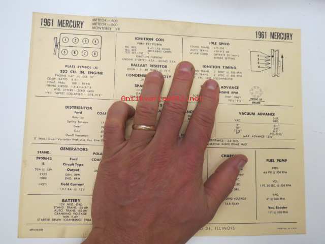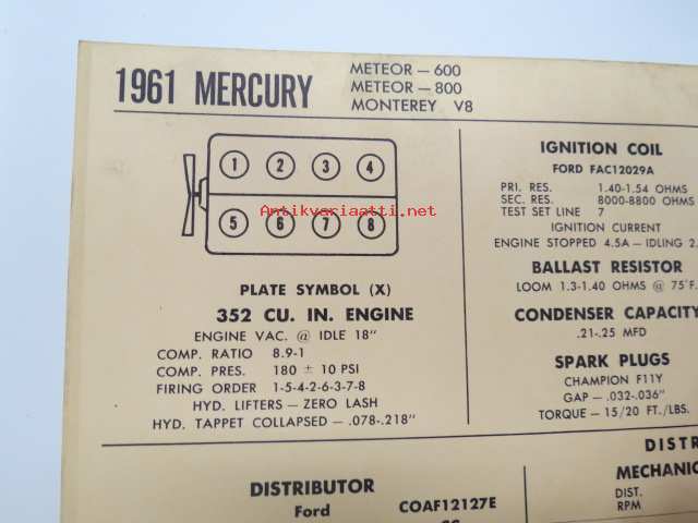 Mercury Meteor 600, Meteor 800, Monterey V8 1961 Data sheet / Sun Electric Corporation -säätöarvot taulukko