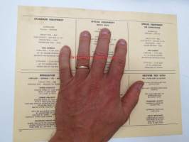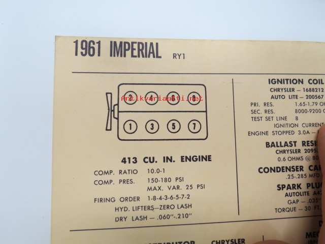 Imperial RY1 1961 Data sheet / Sun Electric Corporation -säätöarvot taulukko