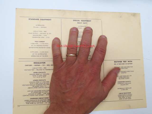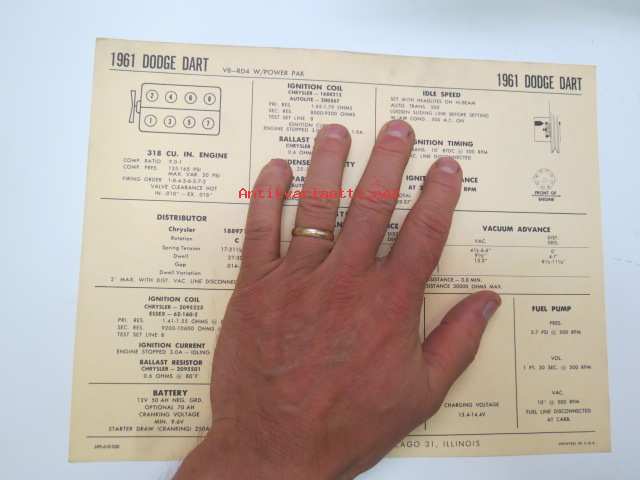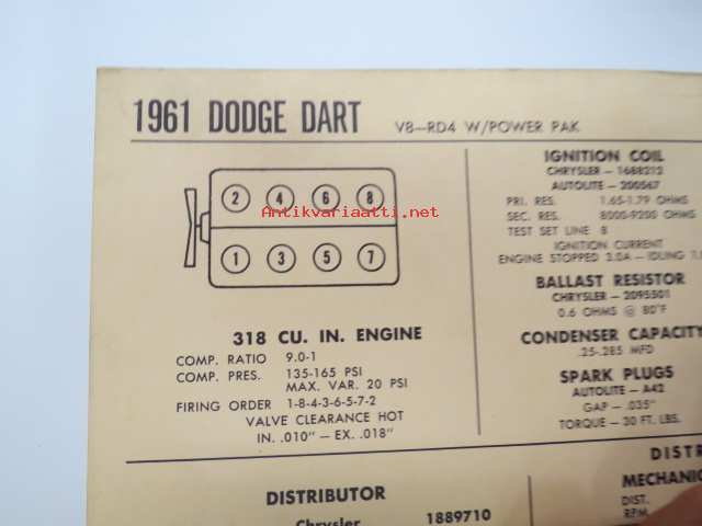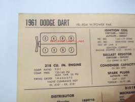 Dodge Dart V8-RD4, W/Power Pak 1961 Data sheet / Sun Electric Corporation -säätöarvot taulukko