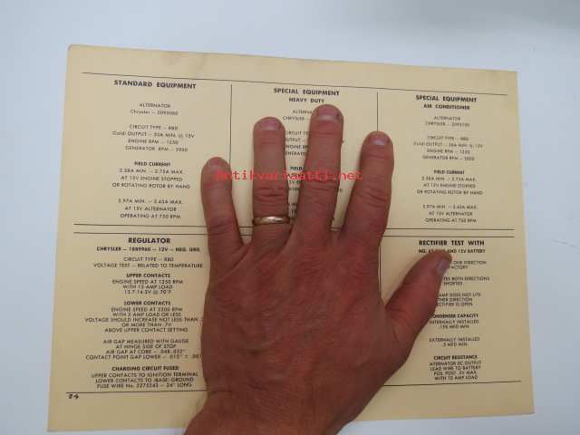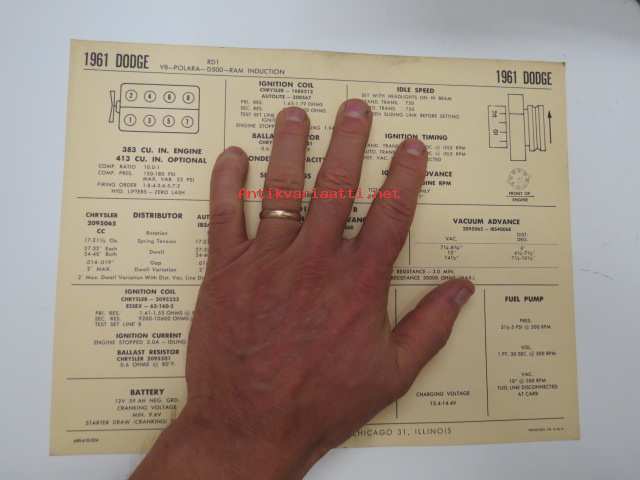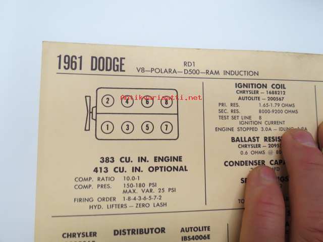 Dodge RD1, V8-Polara-D500-RAM Induction 1961 Data sheet / Sun Electric Corporation -säätöarvot taulukko