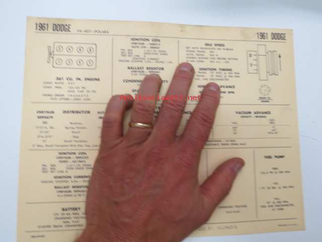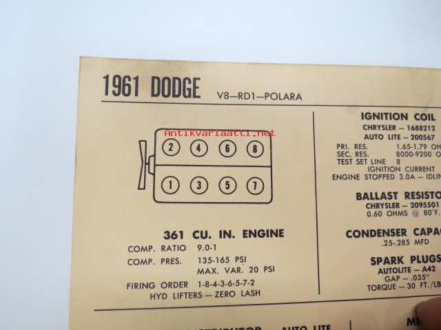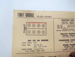 Dodge V8-RD1-Polara 1961 Data sheet / Sun Electric Corporation -säätöarvot taulukko