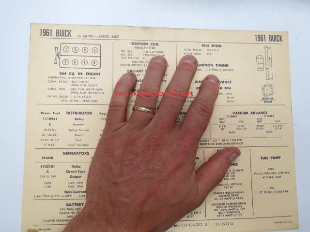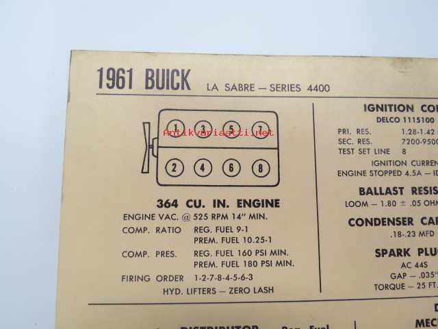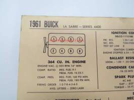Buick Le Sabre Series 4400 1961 Data sheet / Sun Electric Corporation -säätöarvot taulukko