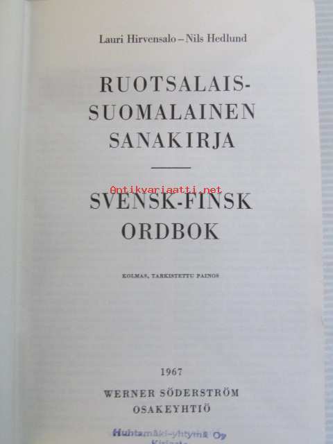 | Saatavilla | 1 kpl | | Julkaisuvuosi | 1967 | | Sivuja | 810 | | Painos | 3. | | Kunto | K3 | | Kansipaperi K2 | | Sidonta/painoasu | Sidottu (kansipaperit) | | Kielet | Suomi, Ruotsi |