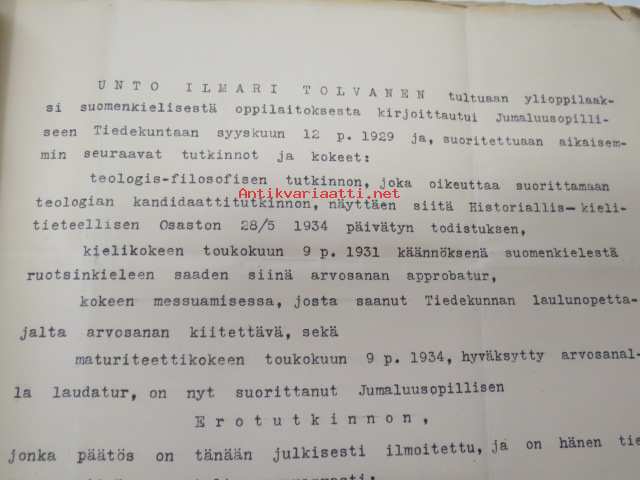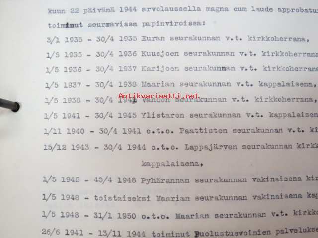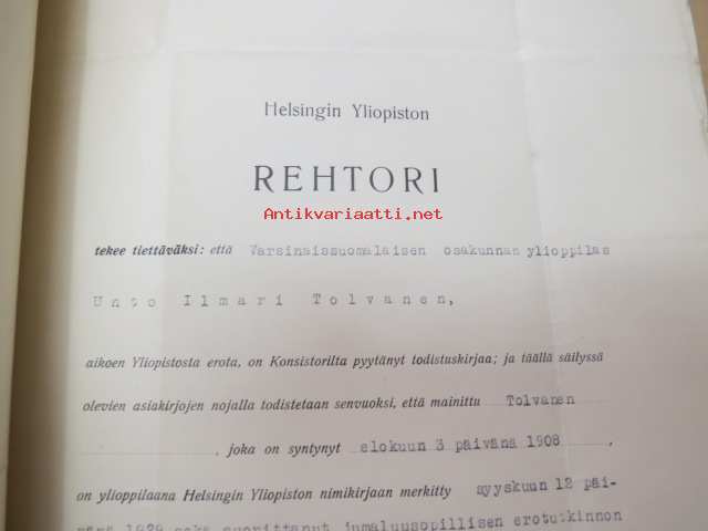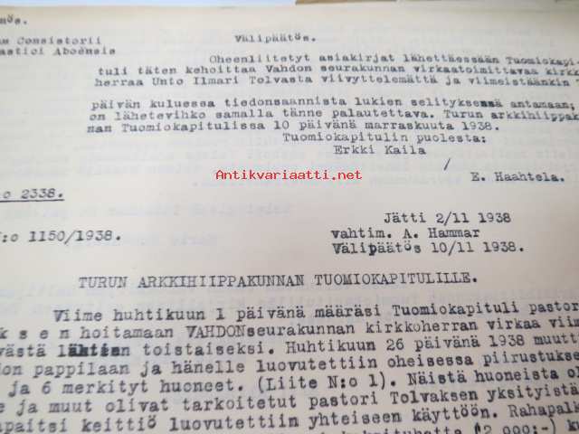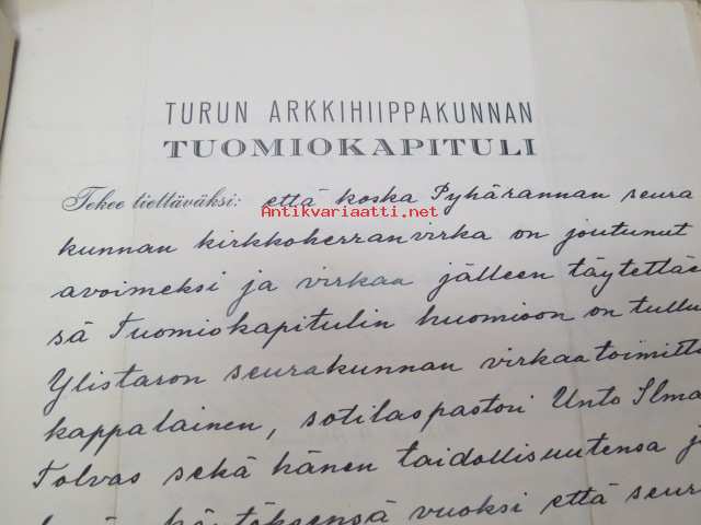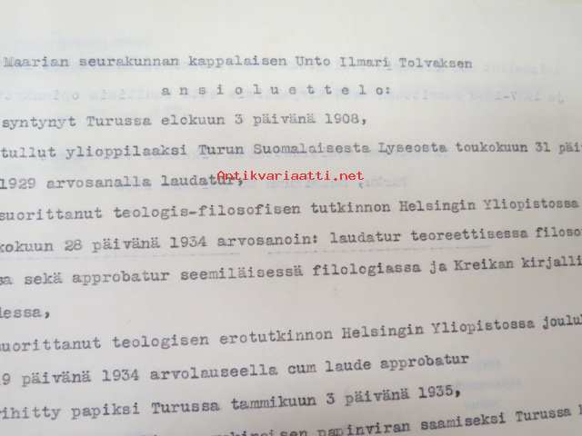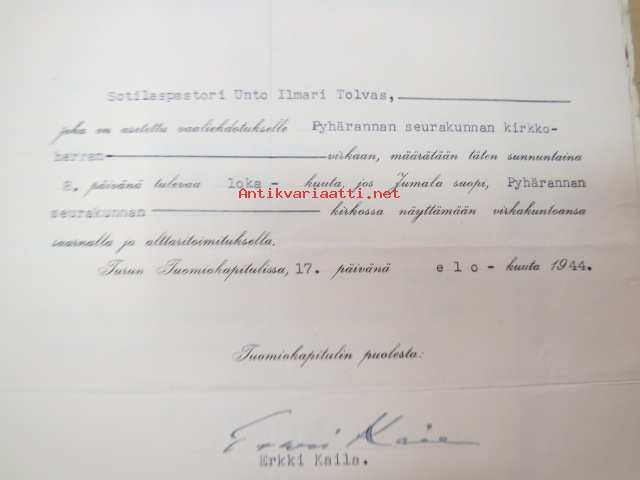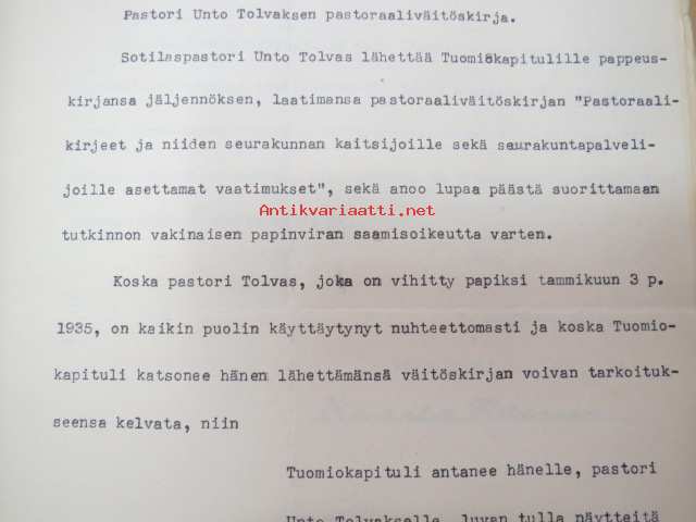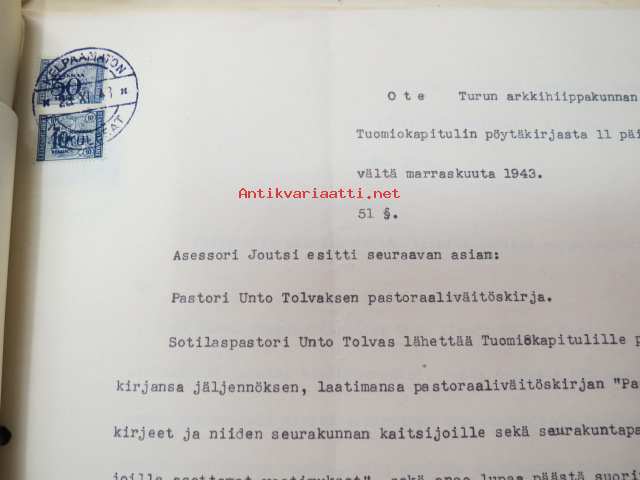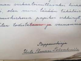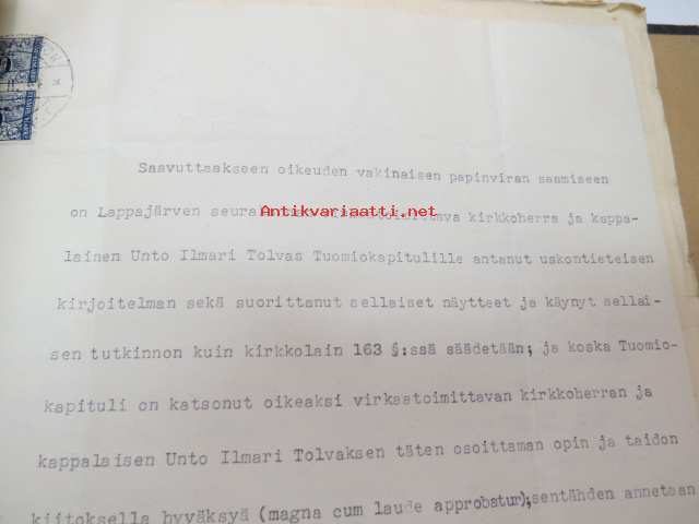 Unto Ilmari Tolvanen - (nimenmuutoksen jälkeen) Tolvas - kansiollinen pappisuraan liittyviä todistuksia, nimityskirjoja, asiakirjoja jne.