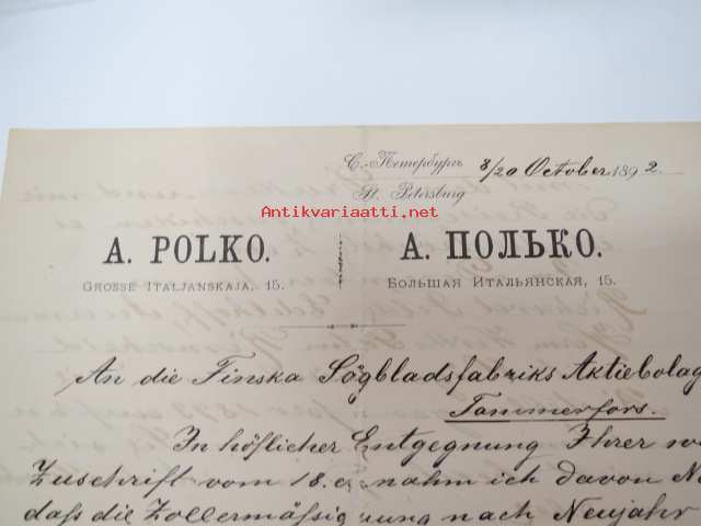 A. Polko (Grosse Italijanskaja 15, St. Petersburg), 8 /20.10.1892 -liikekirje -business letter