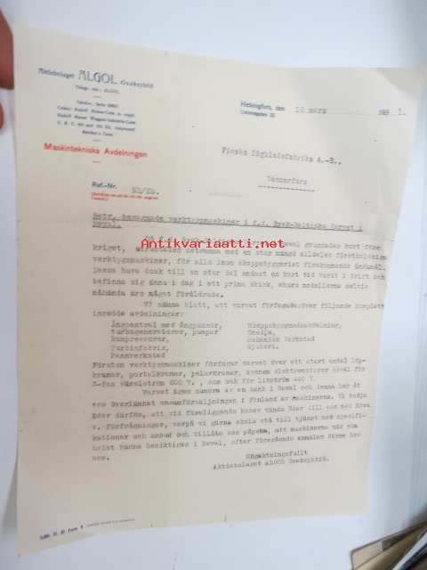Ab Algol Oy, Helsingfors, 10.3.1931 -liikekirje -business letter