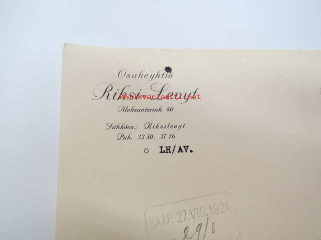 Oy Riksi-Levyt, Helsinki, 26.8.1924 -liikekirje -business letter