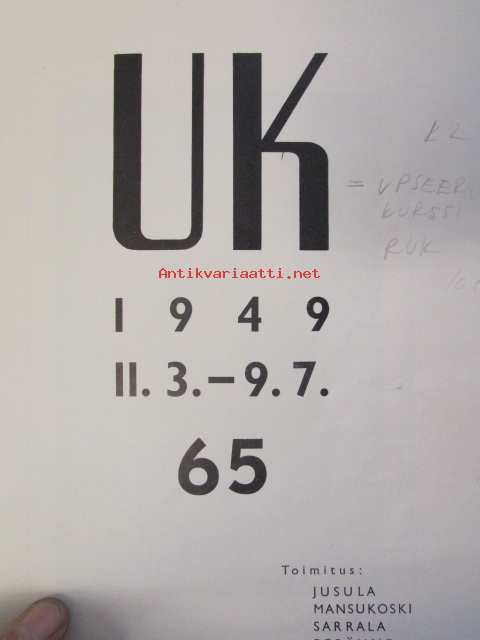 | Saatavilla | 1 kpl | | Julkaisuvuosi | 1949 | | Sivuja | 105 | | Kunto | K2 | | Sidonta/painoasu | Nidottu (pehmeäk.) | | Kielet | Suomi |