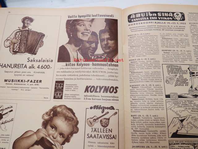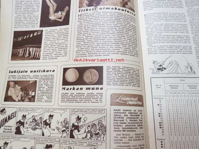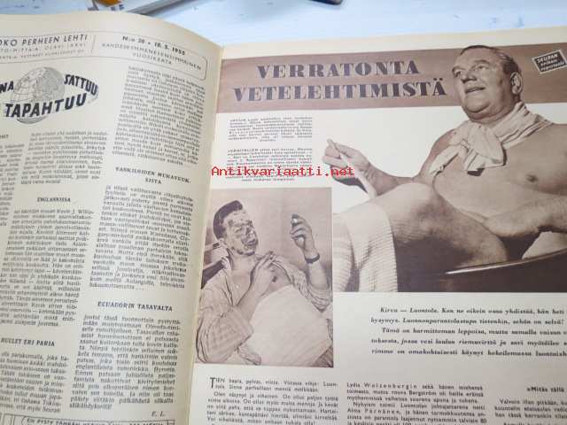 Yhtyneet Kuvalehdet Oy, 1955Seura 1955 nr 20, ilmestynyt 18.5.1955, sis. mm. seur. artikkelit / kuvat / mainokset; Verratonta vetelehtimistä - Kirvu - Luontola, Hilima Kekkonen, Rotusääret, Arthur Conan Doyle - Kullanpyytäjän seikkailu, Outsider - viittä vaille Haaremissa, Valo, Nestle, Fazerina, ym.