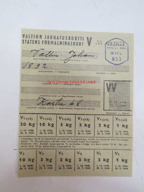 Valtion jauhatuskortti V - 1948, Johan Vallin, Kastu