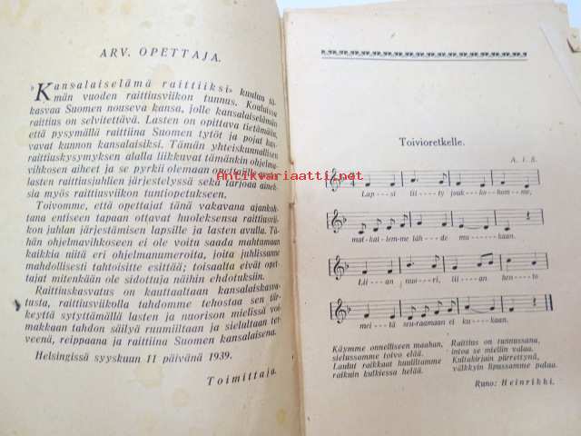 Toivonliiton ohjelmisto Lasten ja nuorison raittiusviikkoa varten 29.10 - 5.11 vuonna 1939