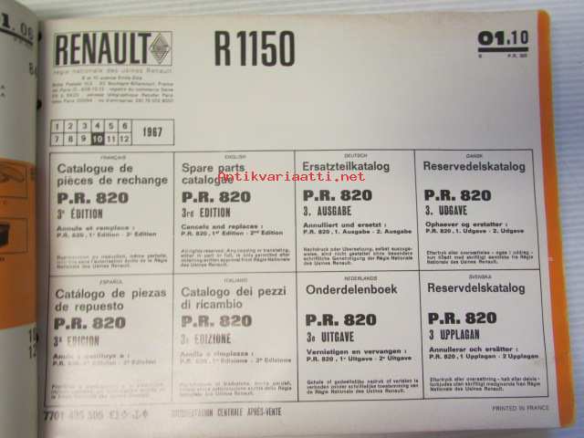 Renault P.R. 820 Catalogue de Pieces Rechange R1150 - Renaultin alkuperäisten osien varaosaluettelo.