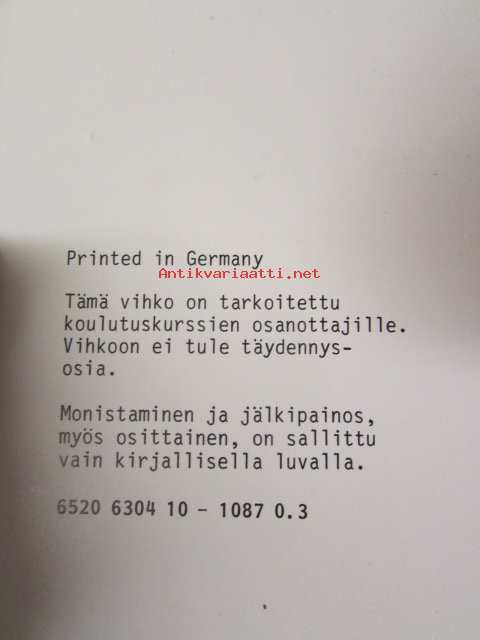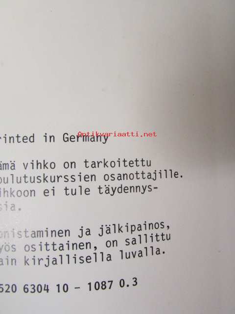 | Saatavilla | 1 kpl | | Julkaisuvuosi | 1987 | | Sivuja | 97 | | Kunto | K2 | | Sidonta/painoasu | Nidottu (pehmeäk.) | | Kielet | Suomi |