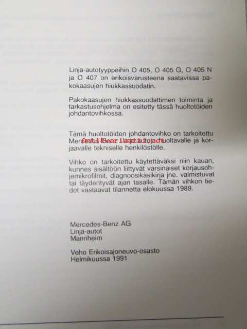 Mercedes-Benz Katalyyttisesti puhdistuva pakokaasujen hiukkassuodatin, Linja-autotyyprihin O 405, O 405 G, O 405 N, O 407 - Huoltotöiden johdantovihko