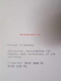 | Saatavilla | 1 kpl | | Julkaisuvuosi | 1990 | | Kunto | K2 | | Sidonta/painoasu | Nidottu (pehmeäk.) | | Kielet | Suomi |