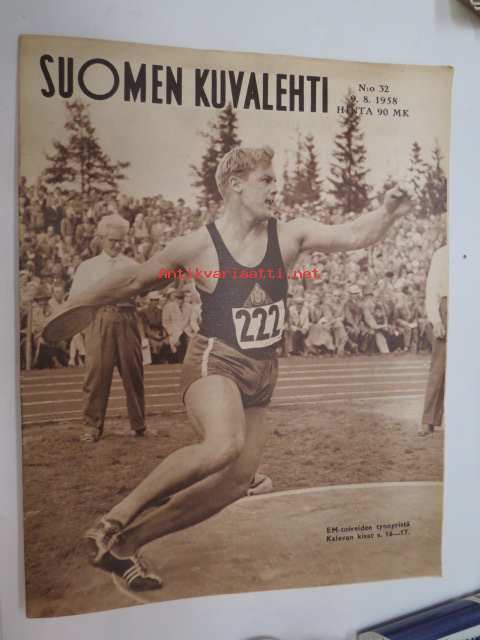 Suomen Kuvalehti 1958 nr 32, ilmestynyt 9.8.1958, sis. mm. seur. artikkelit / kuvat / mainokset; Kansikuva Kalevan kisat, Sanosan, North State, Aarre-arpajaiset,