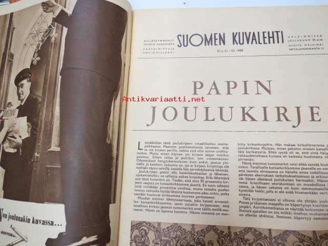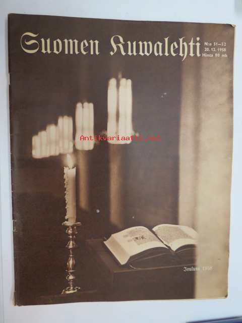 Suomen Kuvalehti 1958 nr 51-52, ilmestynyt 20.12.1958, sis. mm. seur. artikkelit / kuvat / mainokset; Kansikuva "Jouluna 1958", Sheaffer´s amerikkalainen laatukynä, Airam, Voi, F.E. sillanpää & Olavi Kares joulukirjeet, Kim Borg - taivaanlahja, Mikä Kopin kohtaloksi - kesy hirvenvasa ruokolahtelaisen Heinosen perheen sisähirvi - nyt ongelmahirvi, Marilyn Monroe, Markka täyttää 100 vuotta, Iris Uurto, Suomen viikko Stuttgartissa, Armiro, ym.