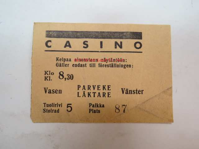 Casino -elokuvateatterin pääsylippu 1940-luvulta