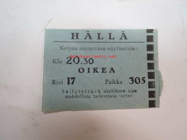Hällä (Tampere) 13.9.1944 -elokuvateatterin pääsylippu