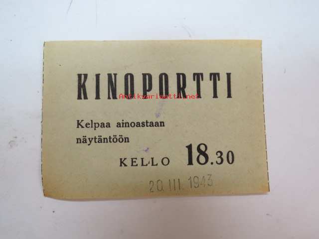 Kinoportti 20.3.1943 -elokuvateatterin pääsylippu