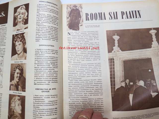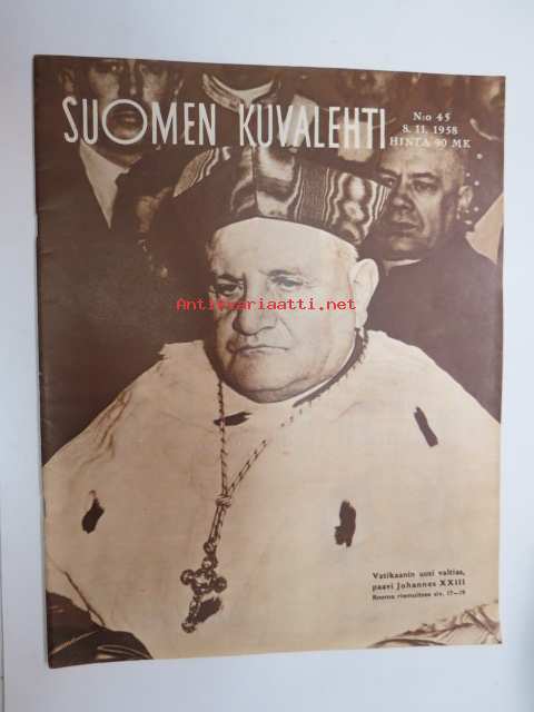Suomen Kuvalehti 1958 nr 45, ilmestynyt 8.11.1958, sis. mm. seur. artikkelit / kuvat / mainokset; Kansikuva Vatikaanin uusi valtias paavi Johannes XXIII, Junghans,