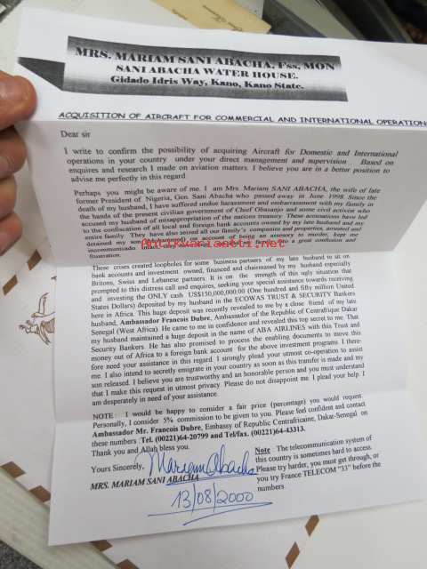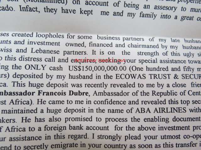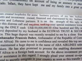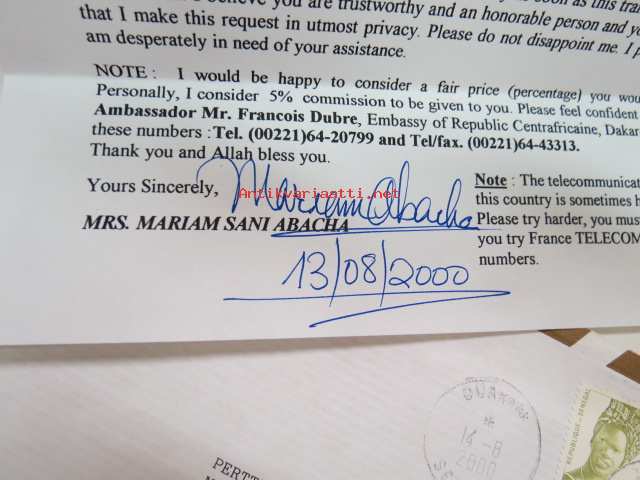 Nigerialaiskirje (Senegalista), huijauskirje, lähetetty suomalaiseen yritykseen 14.8.2000