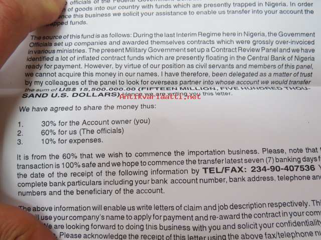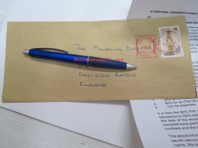 Nigerialaiskirje, huijauskirje, lähetetty suomalaiseen yritykseen
