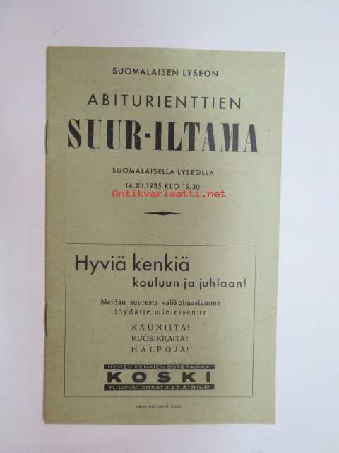 Suomalaisen Lyseon (Turku) abiturienttien suur-iltama Suomalaisella lyseolla 14.12.1935 -ohjelmalehtinen