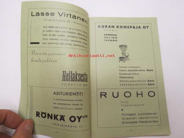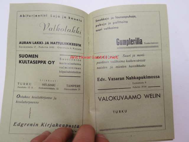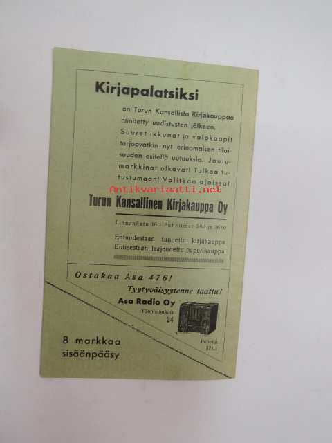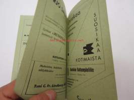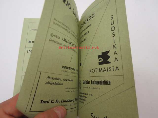 | Saatavilla | 1 kpl | | Sivuja | 16 | | Kunto | K2 | | Sidonta/painoasu | Pienpainate | | Kielet | Suomi |