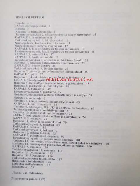 | Saatavilla | 1 kpl | | Julkaisuvuosi | 1973 | | Sivuja | 164 | | Kunto | K2 | | Sidonta/painoasu | Nidottu (pehmeäk.) | | ISBN | 951-95155-0-X | | Kielet | Suomi |