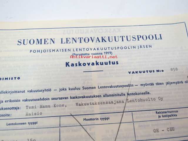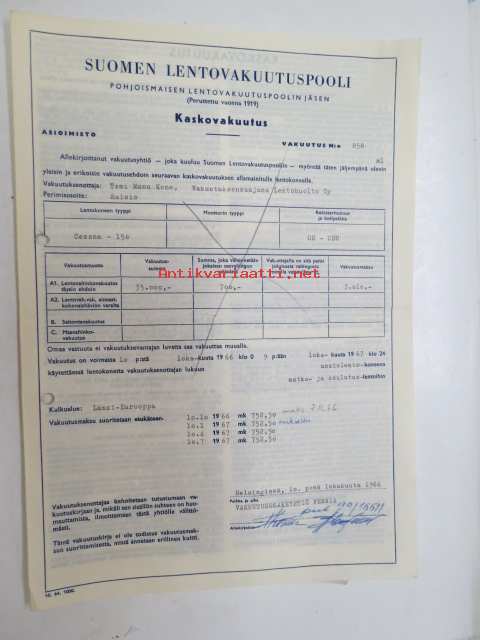 Suomen Lentovakuutuspooli - Kaskovakuutus, vakuutus nr 858, 1967 - Cessna 150 OH-CEU, ansiolentokone -vakuutuskirja