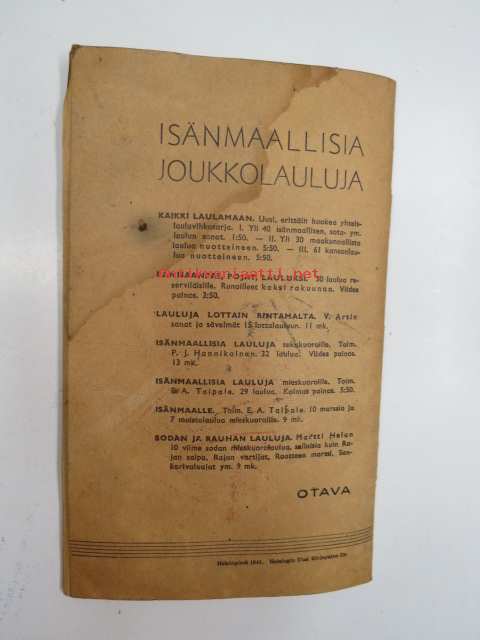 | Saatavilla | 1 kpl | | Julkaisuvuosi | 1941 | | Sivuja | 61 | | Painos | 1. | | Kunto | K2 | | Sidonta/painoasu | Nidottu (pehmeäk.) | | Kielet | Suomi |