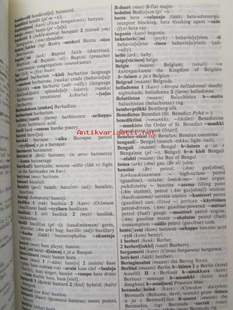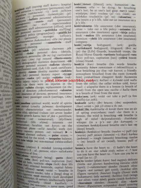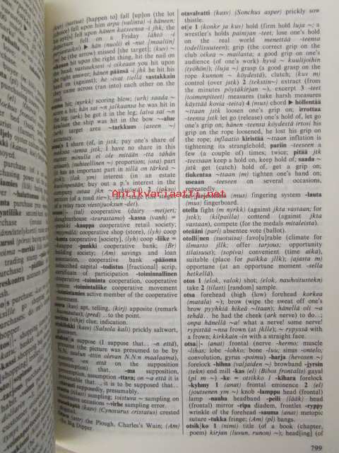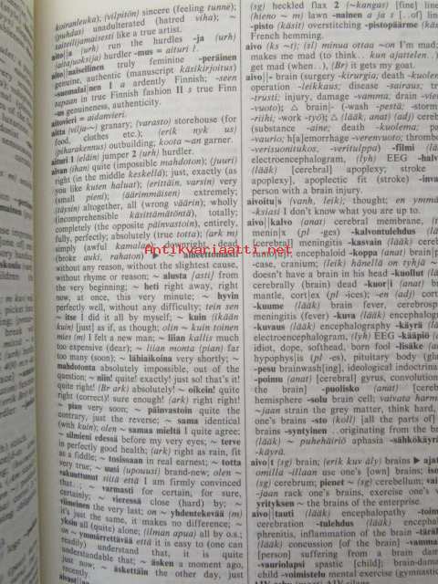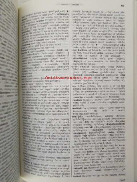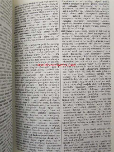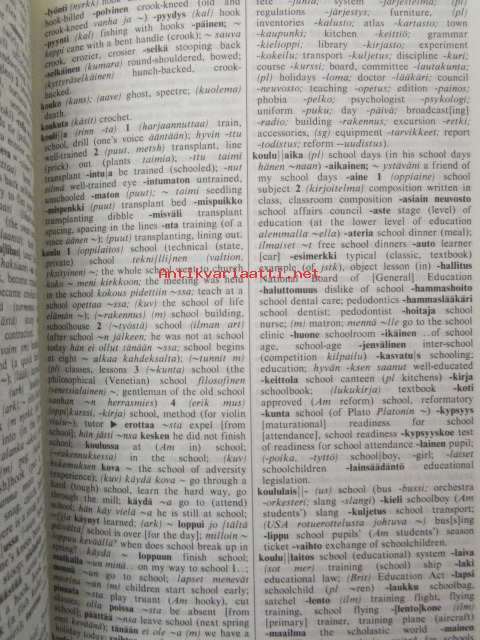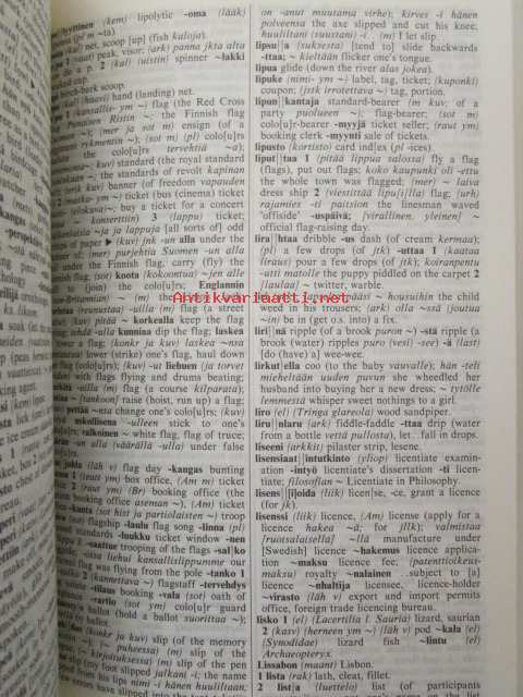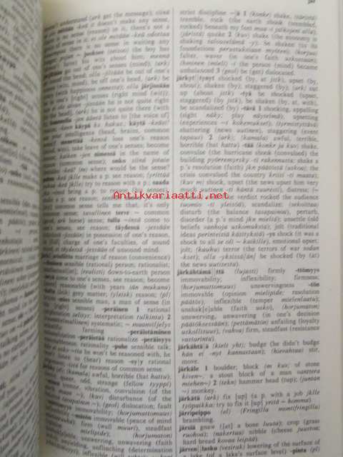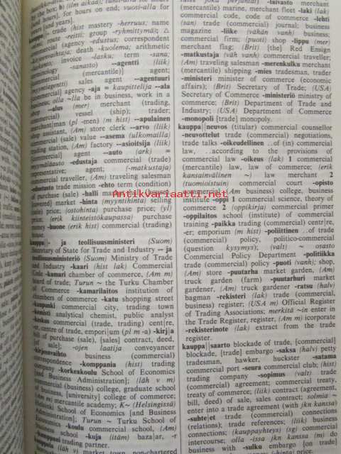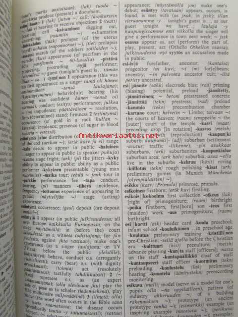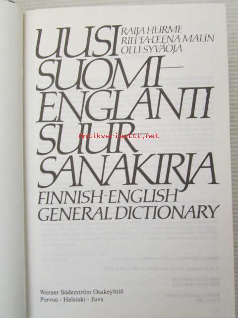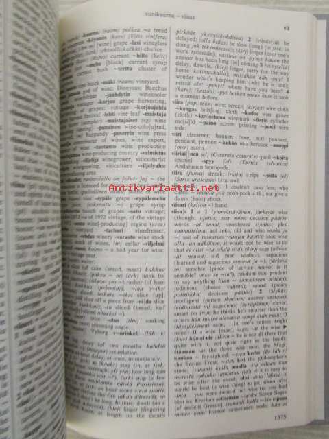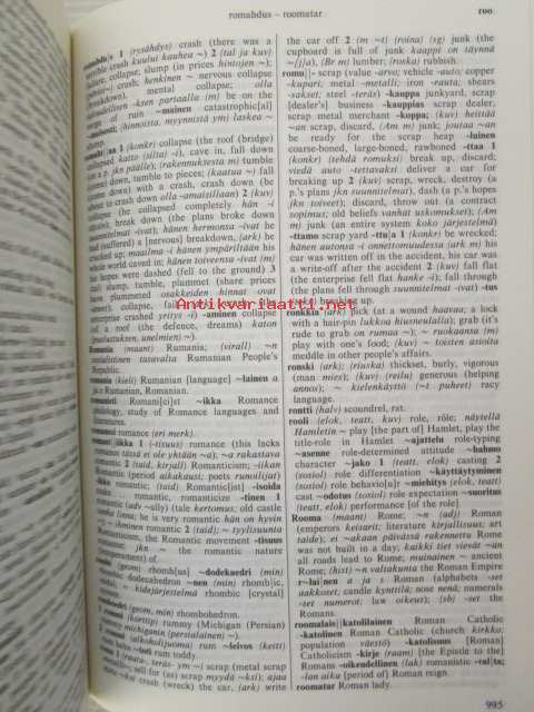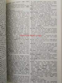 | Saatavilla | 1 kpl | | Julkaisuvuosi | 1987 | | Sivuja | 1446 | | Kunto | K2 | | Sidonta/painoasu | Nahkaselkä | | ISBN | 951-0-14041-4 | | Kielet | Suomi, Englanti |