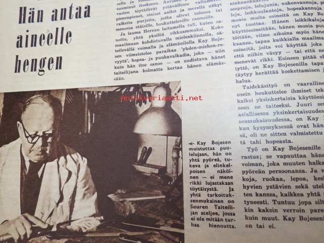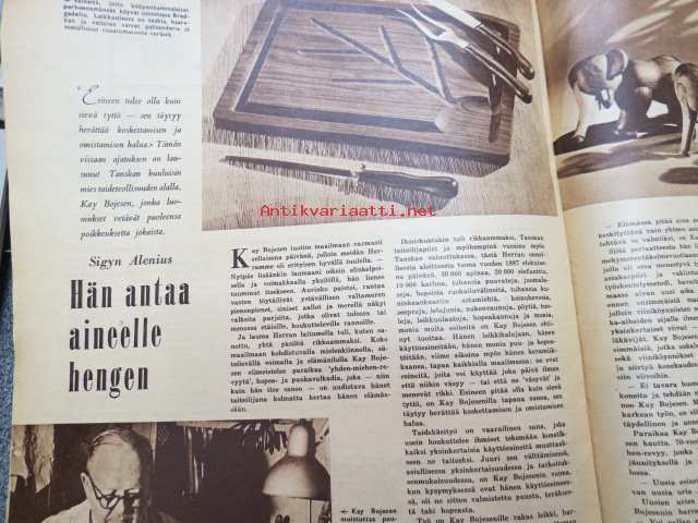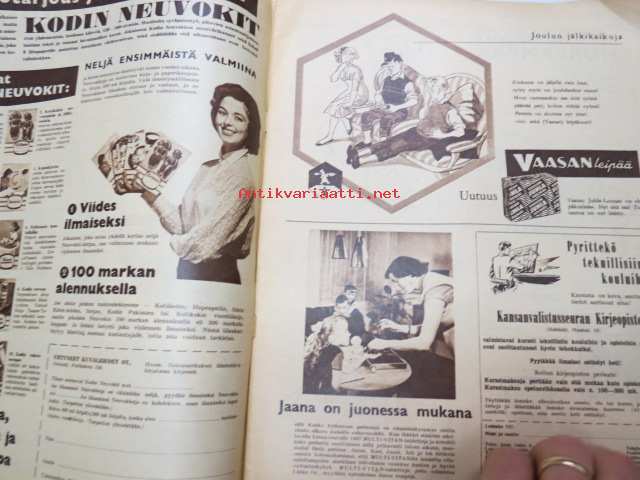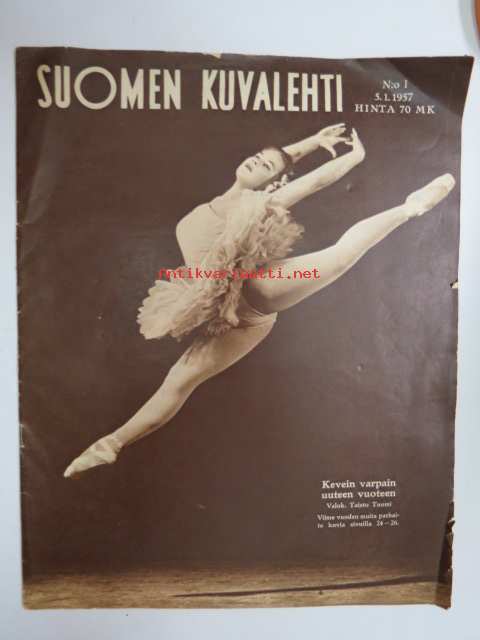 Suomen Kuvalehti 1957 nr 1, ilmestynyt 5.1.1957, sis. mm. seur. artikkelit / kuvat / mainokset; Kansikuva - Balettitanssija, Arvo Puukari - Kasvakaa vain Helsinki - Turku - Tampere, Presidentti Paasikiven hautajaiset, Hopeaseppä Mauno Honkanen - palkittu kakkuveitsi, Rauhanturvaajat Suezin auringossa, Televisio - Radion putkilapsi, Miksei ryijyjä Amerikkaan?, TAnskalainen muotoilija Kay Bojesen, ym.