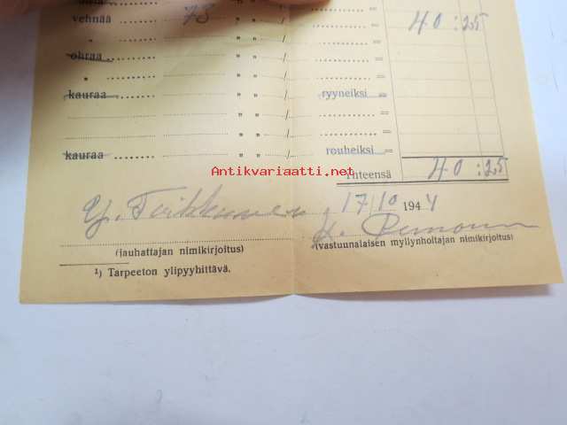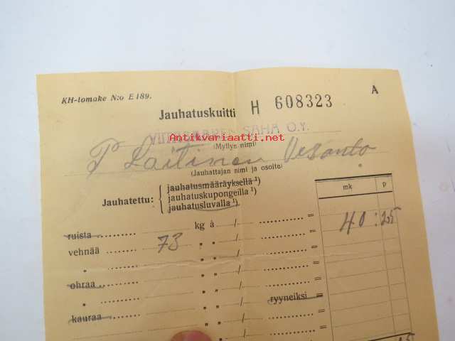 Kansanhuoltolomake E 189 Jauhatuskuitti P. Laitinen, Vesanto / viitasaaren Saha Oy, 17.10.1944