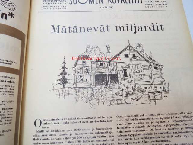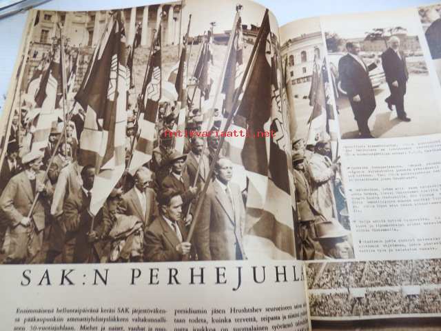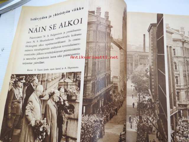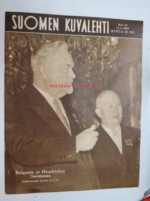 Suomen Kuvalehti 1957 nr 24, ilmestynyt 15.6.1957, sis. mm. seur. artikkelit / kuvat / mainokset; Kansikuva Bulganin & Hrutsev Suomessa, Jaguar-polkupyörä, Heves-nailonsukat, Mätänevät miljardit - rappeutuvat seurintalot ym., Polioepidemiaa ei tule, SAK juhlii, Suomalainen senaattori Onni Talas, ym.