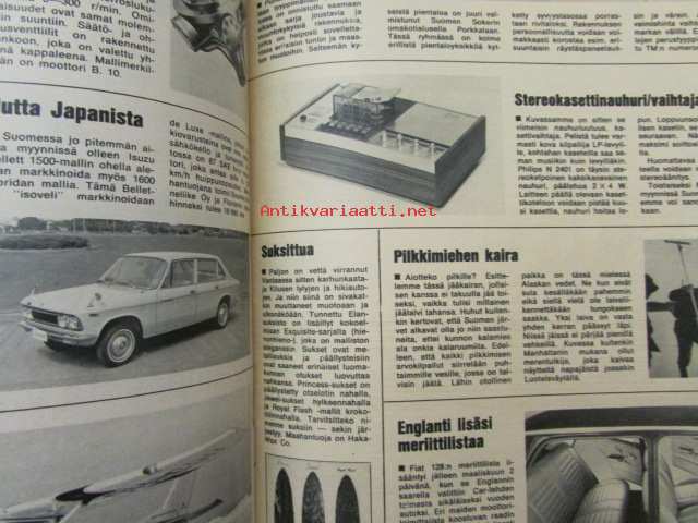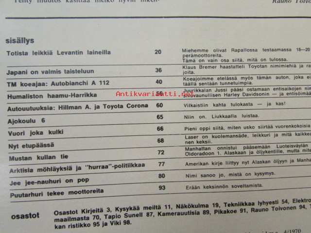 Tekniikan Maailma 1970 nr 4, sis. mm. seur. artikkelit / kuvat / mainokset; Koeajossa Autobianchi A 112, Sumbeam Avenger ja Toyota Corona, Kasettinauhurit esittelyssä, Testissä perämoottoriuutuudet 18-20hv, katso sisältö kuvista tarkemmin21 x 29 cm.