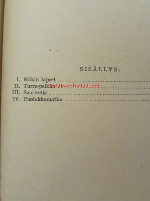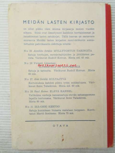 | Saatavilla | 1 kpl | | Julkaisuvuosi | 1946 | | Sivuja | 39 | | Painos | 1 | | Kunto | K2 | | Sidonta/painoasu | Kuvitettu kovakantinen | | Kielet | Suomi |