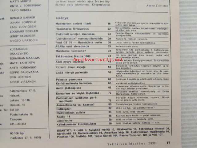 Tekniikan Maailma 1971 nr 2, sis. mm. seur. artikkelit / kuvat / mainokset; Ford GT 70, Koeajossa Mazda 1800, Apollo 14 kuuhun kuin kotiin, TM erikoistesti - Autot jääkaapissa, Kaitafilmiprojektori Eumig-Mark-S-709, Daimler-Benz mittausosasto Maanteiden siniset ritarit - Poliisit, katso sisältö kuvista tarkemmin.21 x 29 cm.