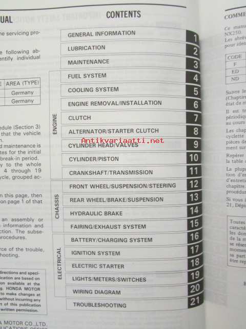 Honda NX250, Shop Manual -Korjaamokäsikirja, katso sisältö kuvista tarkemmin