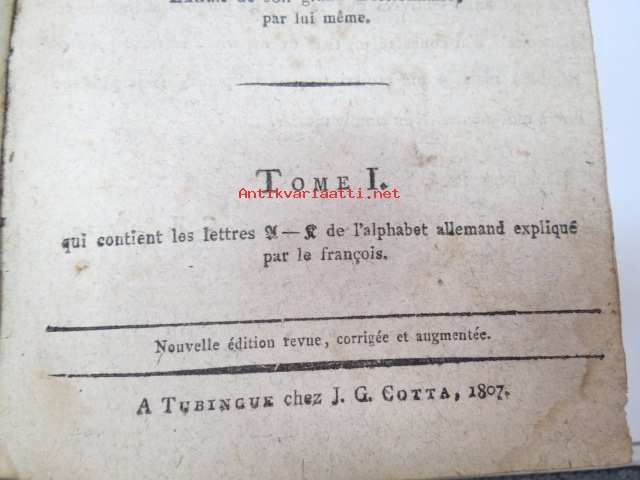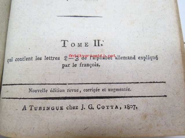 | Saatavilla | 1 kpl | | Julkaisuvuosi | 1807 | | Sivuja | 928 + 362 | | Painos | 1. | | Kunto | K2 | | Kulunut | | Sidonta/painoasu | Nahkaselkä | | Kielet | Saksa, Ranska |