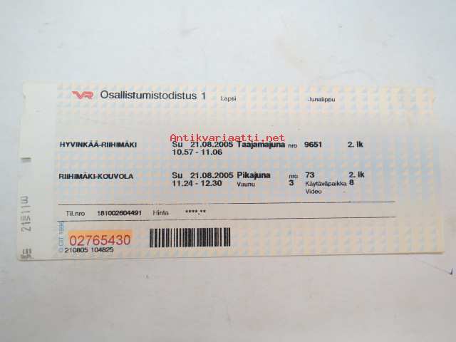 VR Osallistumistodistus 1 Lapsi Hyvinkää-Riihimäki / Riihimäki-Kouvola taajamajuna 21.8.2005