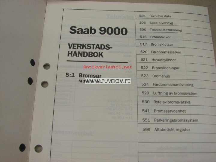 Saab 9000 Verkstadshandbok 5:1 Bromsar M 1985-90 -korjaamokirjasarjan osa ruotsiksi