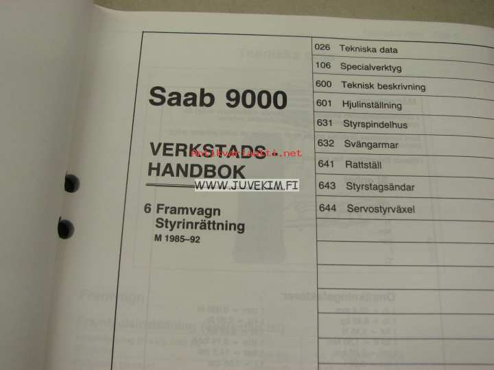 Saab 9000 Verkstadshandbok 6 Framvagn, Styrinrättning M 1985-92 -korjaamokirjasarjan osa ruotsiksi