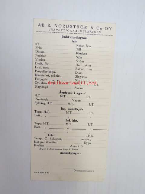 Ab Ragnar Nordström & Co Oy - Inspektionsavdelningen - Indikator diagram från S/S... ångtryck -laivahöyrykoneen paineen raporttikortteja - testi tehty laivassa ja kortti lähetetty konttoriin -blanco, käyttämätön vuodelta 1940